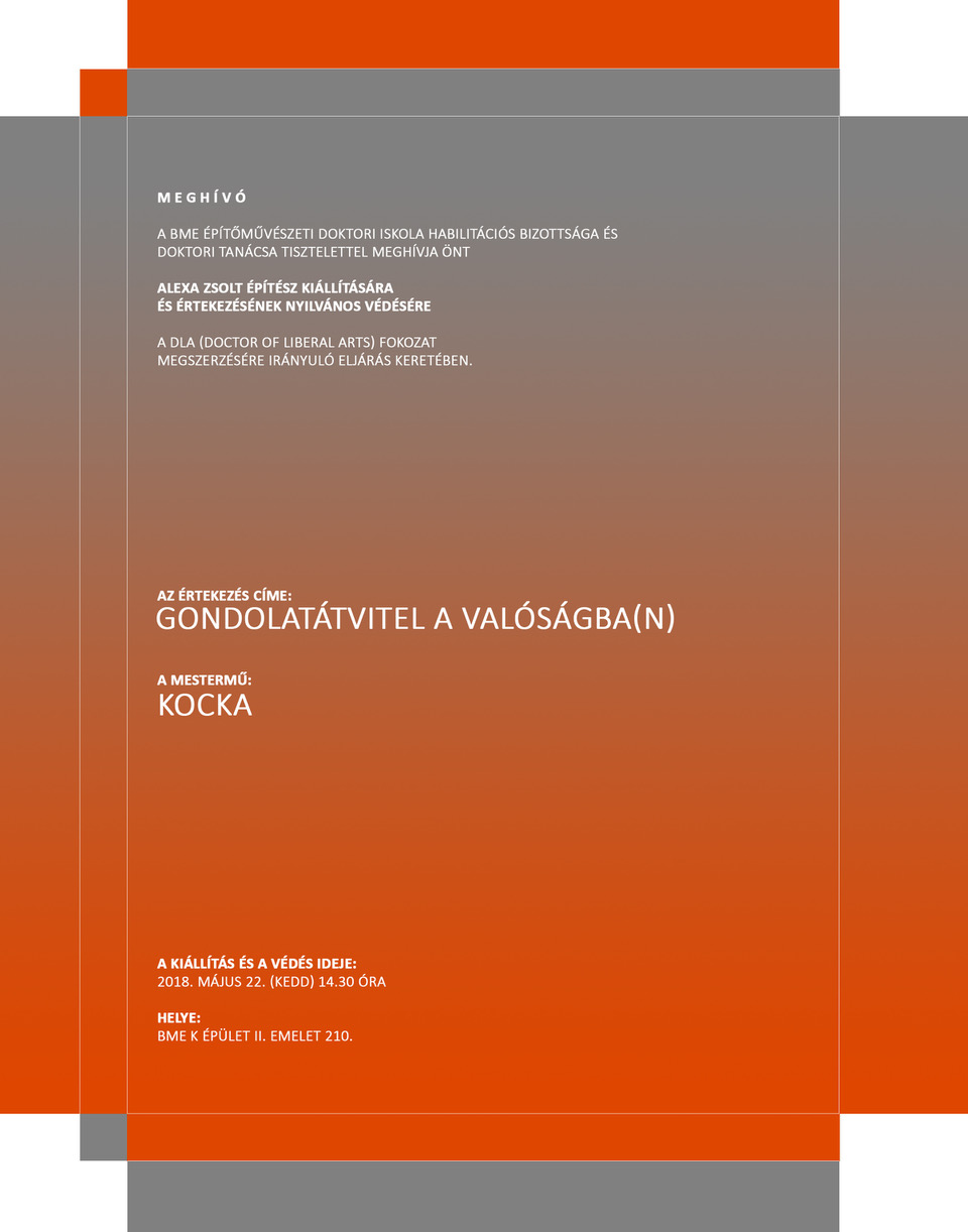 A BME Építőművészeti Doktori Iskola Habilitációs Bizottsága és Doktori Tanácsa tisztelettel meghívja Önt Alexa Zsolt építész kiállítására és értekezésének nyilvános védésére a DLA (Doctor of Liberal Arts) fokozat megszerzésére irányuló eljárás keretében.