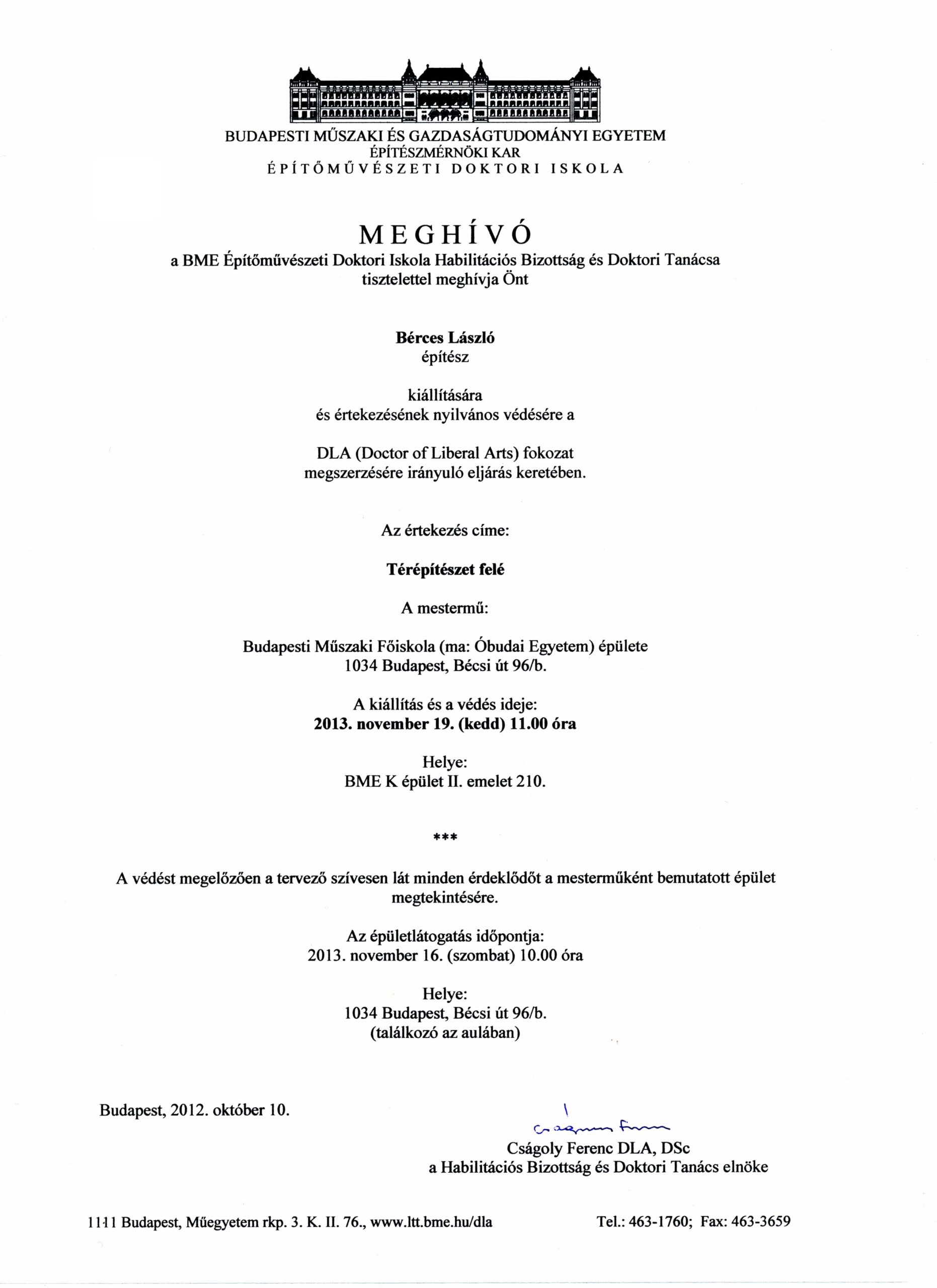 Bérces László kiállítása és nyilvános védése Térépítészet felé hír Meghívó A kiállítás és védés ideje 2013. november 19. 11:00 helyszín: BME K épület II. emelet 210.