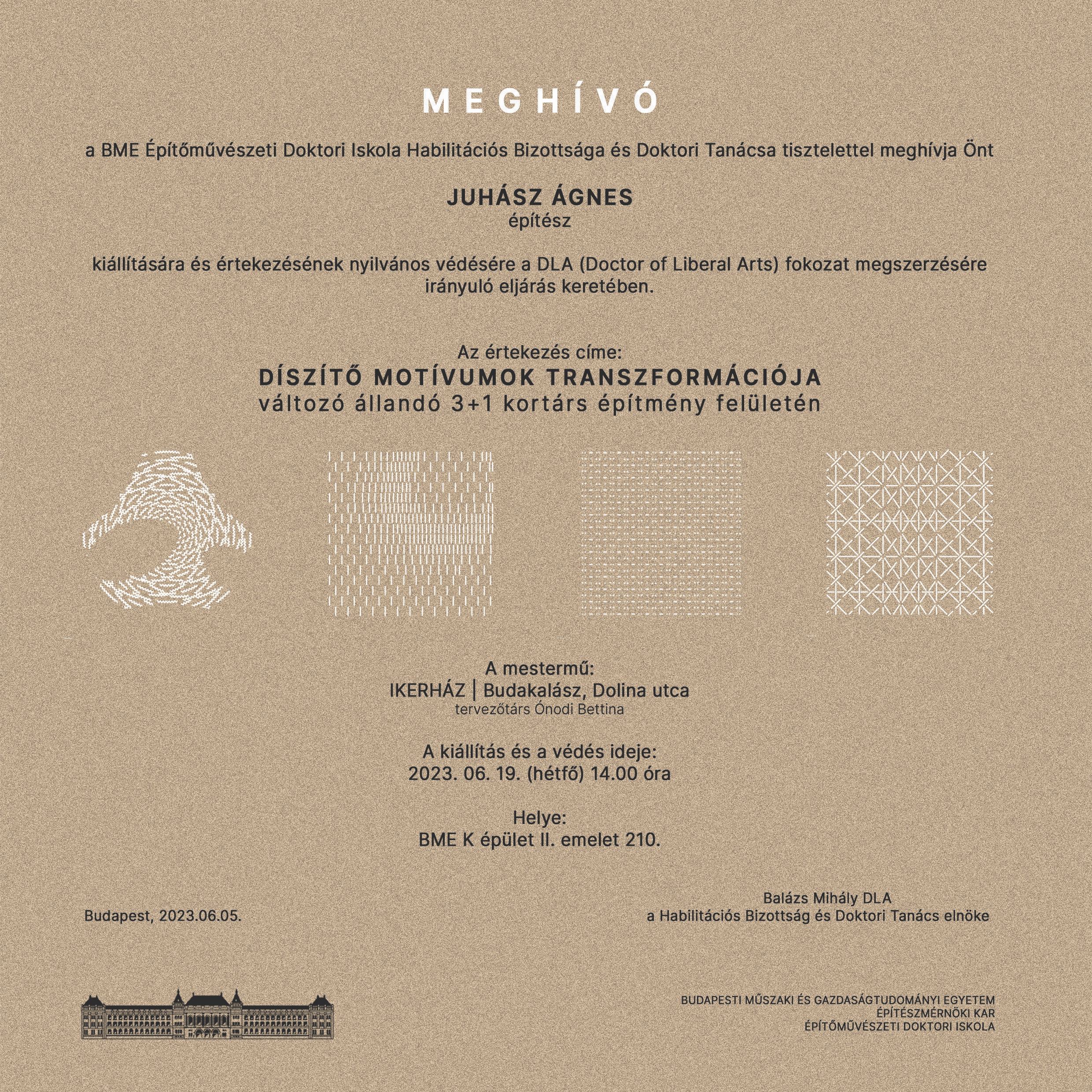 A BME Építőművészeti Doktori Iskola Habilitációs Bizottsága és Doktori Tanácsa tisztelettel meghívja Önt JUHÁSZ ÁGNES építész kiállítására és értekezésének nyilvános védésére a DLA (Doctor of Liberal Arts) fokozat megszerzésére irányuló eljárás keretében.