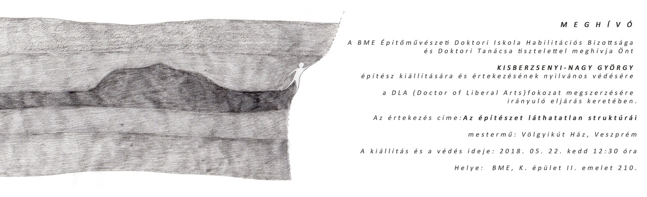 A BME Építőművészeti Doktori Iskola Habilitációs Bizottsága és Doktori Tanácsa tisztelettel meghívja Önt Kisberzsenyi-Nagy György építész kiállítására és értekezésének nyilvános védésére a DLA (Doctor of Liberal Arts) fokozat megszerzésére irányuló eljárás keretében.