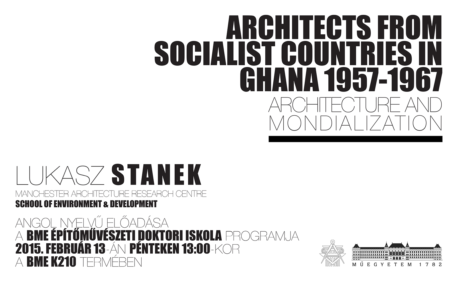 A BME Építőművészeti Doktori Iskola meghívására Lukasz Stanek angol nyelvű előadást tart 2015. február 13-án, pénteken délután egy órától. Az előadás címe: Architects from Socialist Countries in Ghana 1957-67 – Architecture and Mondialization. Minden érdeklődőt szeretettel várunk!