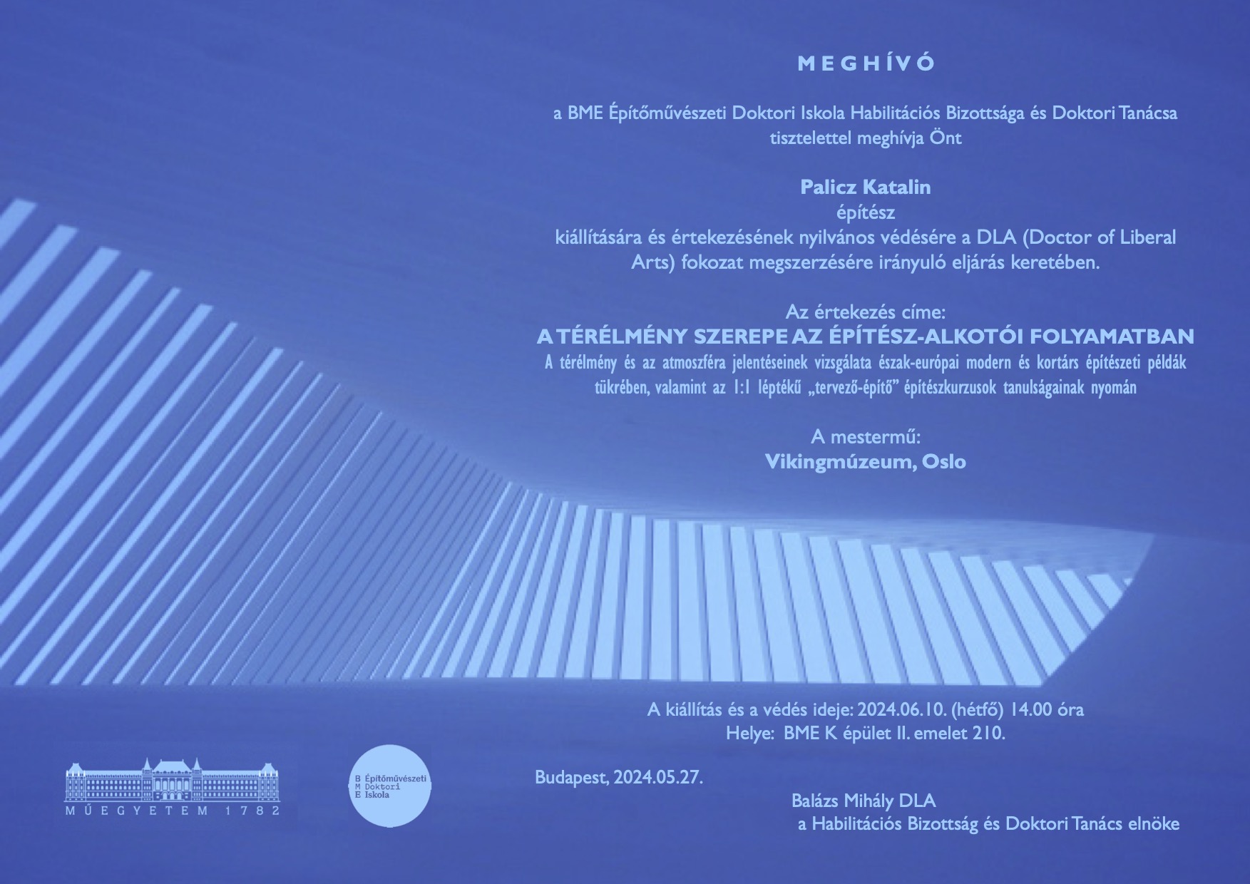 A BME Építőművészeti Doktori Iskola Habilitációs Bizottsága és Doktori Tanácsa tisztelettel meghívja Önt Palicz Katalin építész kiállítására és értekezésének nyilvános védésére a DLA (Doctor of Liberal Arts) fokozat megszerzésére irányuló eljárás keretében.