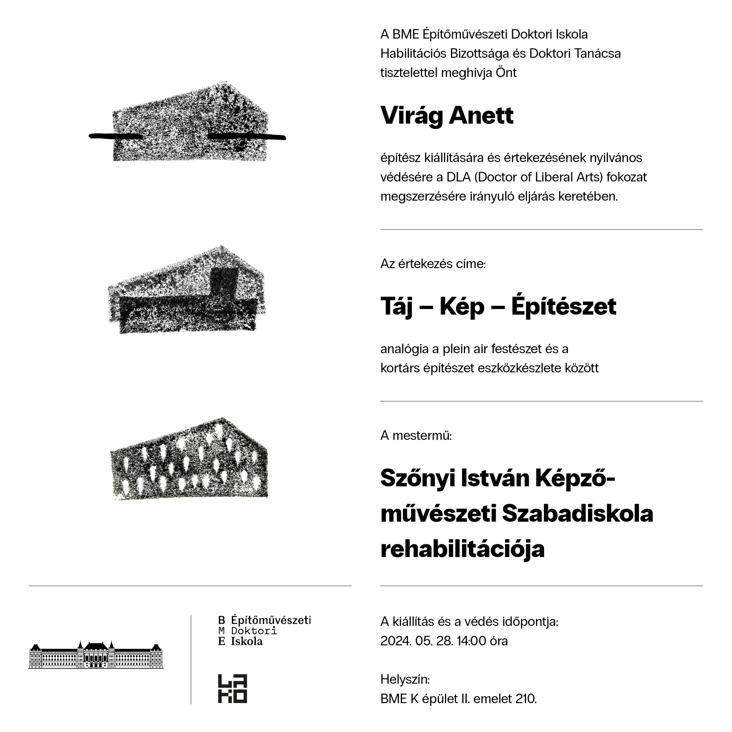 A BME Építőművészeti Doktori Iskola Habilitációs Bizottsága és Doktori Tanácsa tisztelettel meghívja Önt Virág Anett építész kiállítására és értekezésének nyilvános védésére a DLA (Doctor of Liberal Arts) fokozat megszerzésére irányuló eljárás keretében.